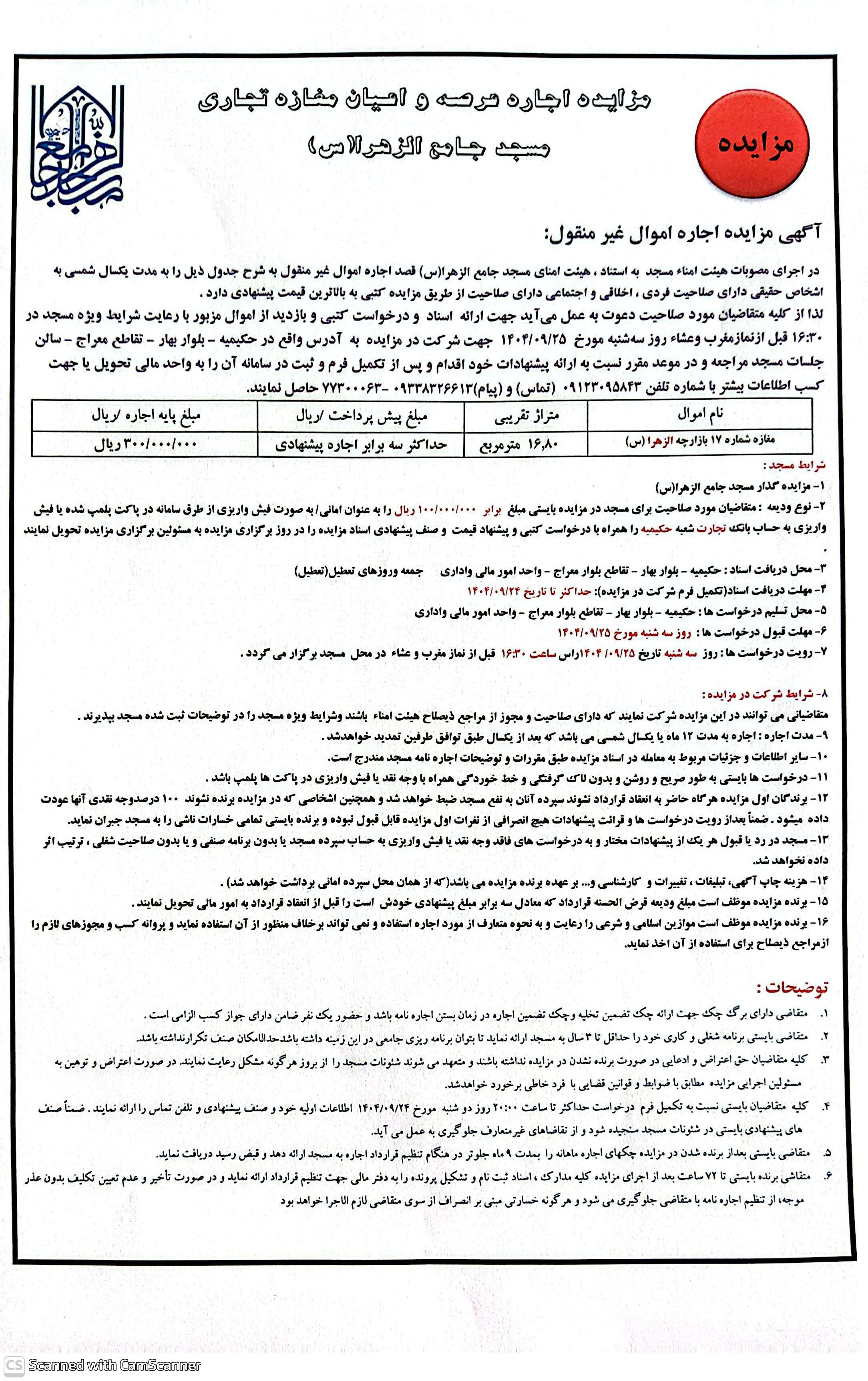 هیئت امنای محترم مسجد جامع الزهرا (س)، واقع در[حکیمیه تهرانپارس]، به استناد مجوزهای قانونی و بهمنظور بهرهبرداری بهینه از امکانات مسجدی و تأمین بخشی از هزینههای جاری و فرهنگی ، در نظر دارد یک باب واحد تجاری شامل عرصه و اعیان متعلق به مسجد را از طریق مزایده عمومی و به صورت اجاره به افراد حقیقی واجد شرایط واگذار نماید.
